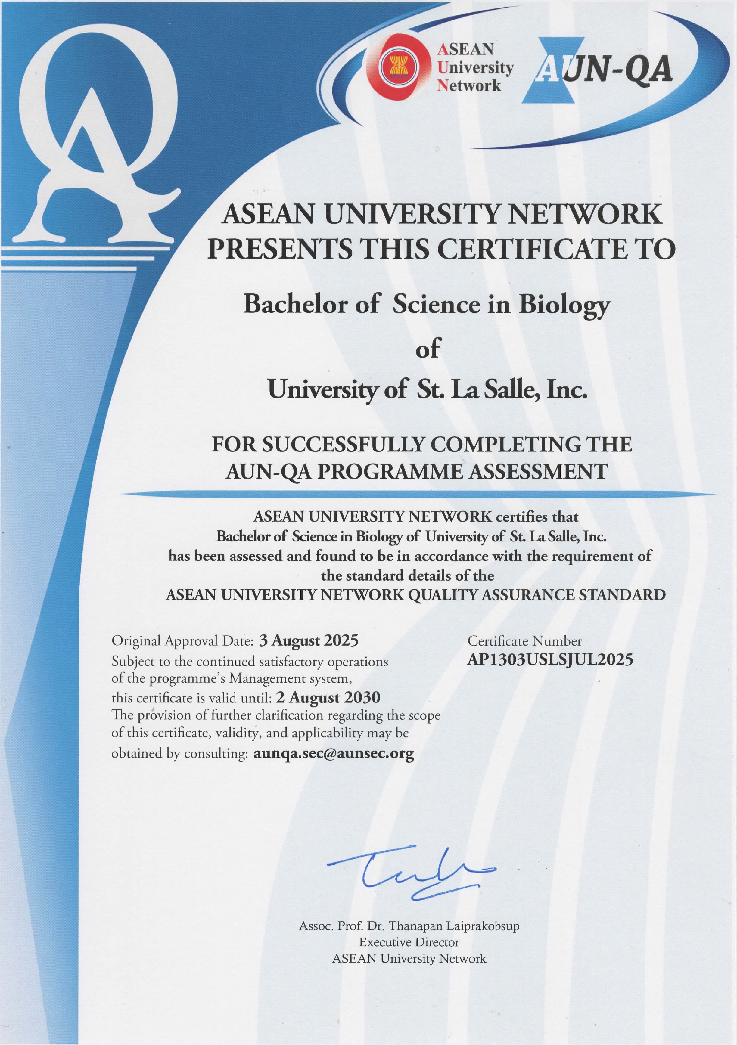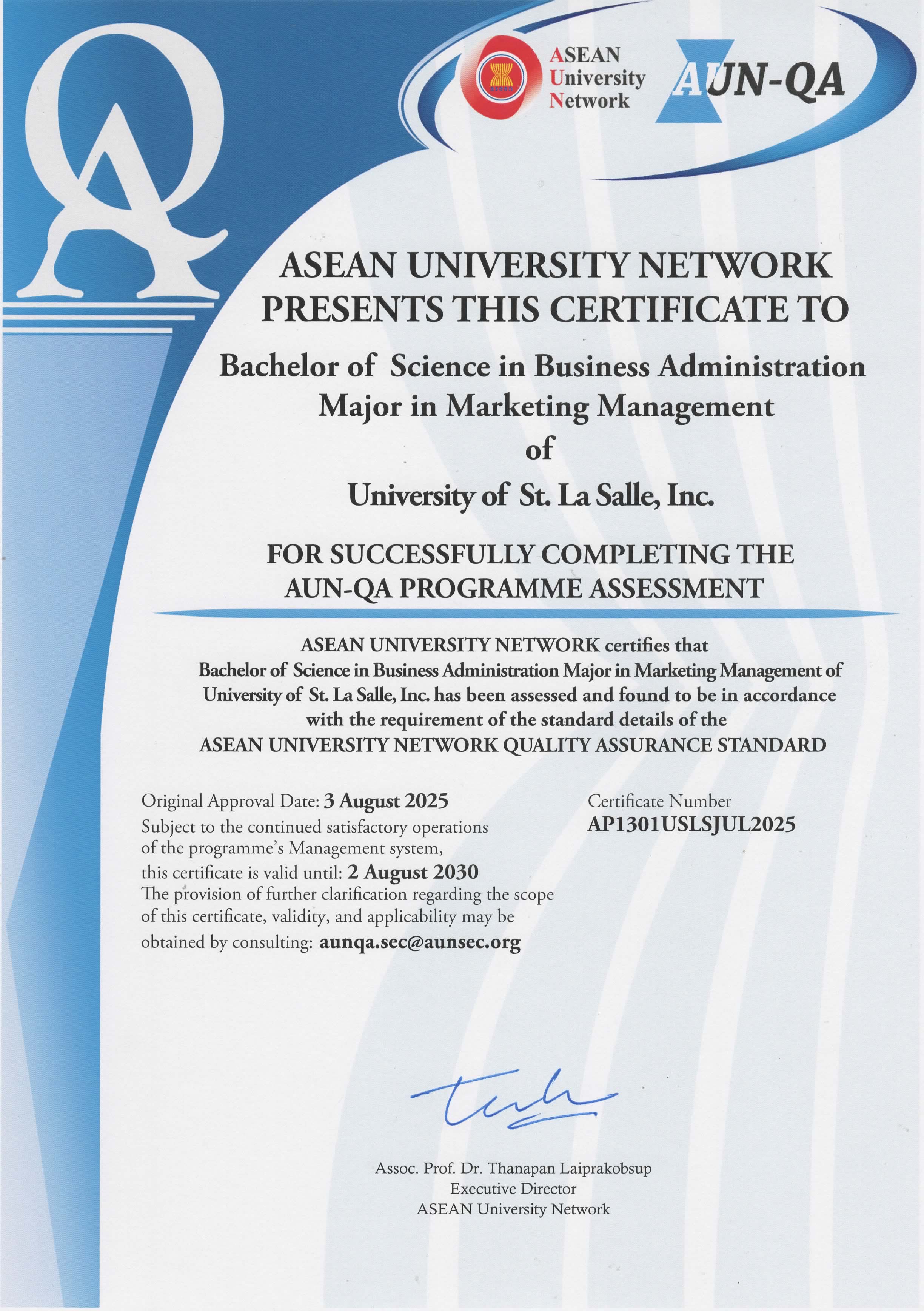 The assessment confirmed that the programs meet the ASEAN University Network Quality Assurance standards.