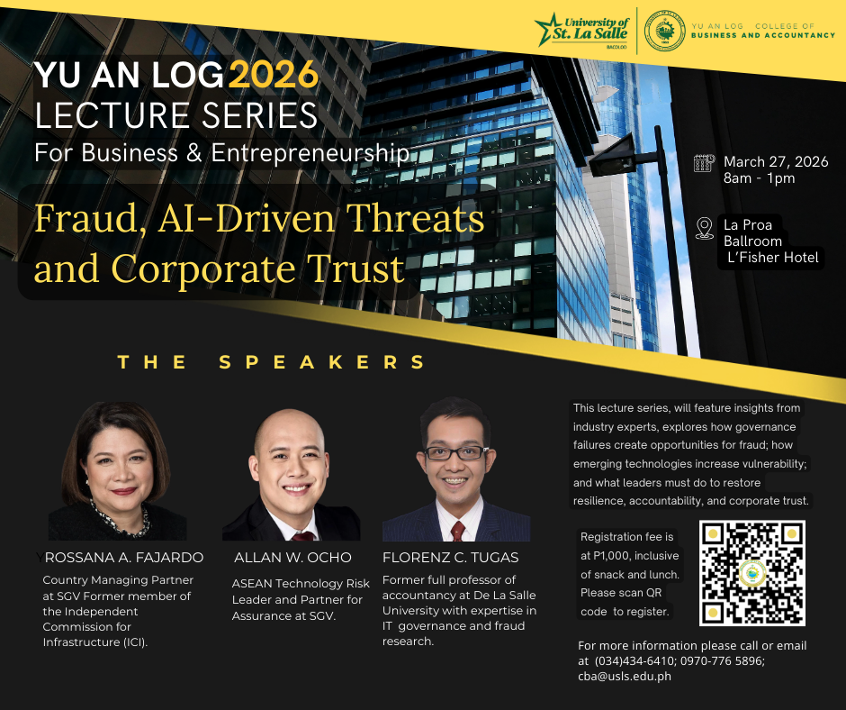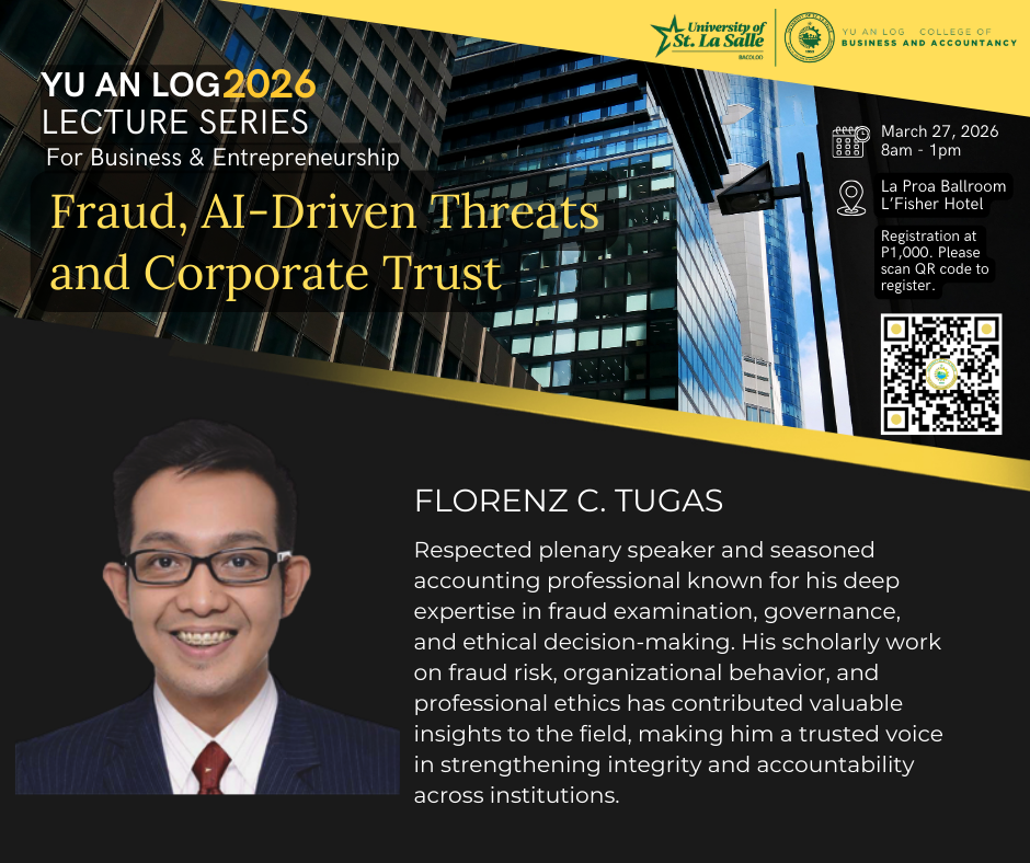 The University’s Yu An Log College of Business and Accountancy will host the Yu An Log 2026 Lecture Series for Business and Entrepreneurship through the session “Fraud, AI-Driven Threats, and Corporate Trust” on March 27, from 8:00 AM to 1:00 PM at the La Proa Ballroom, L Fisher Hotel.